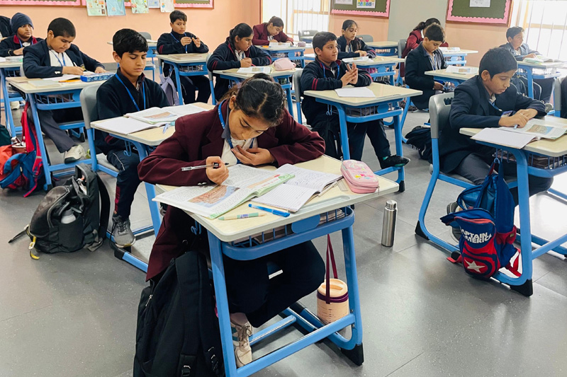 The Middle School works to provide a balance between attention to basics and equipping them with necessary skills and knowledge. At this stage students are given opportunities to explore a wide variety of interests and experiences. The curriculum is based on a core of courses in English, Hindi, Mathematics, Social Studies, Science, third language (French or Sanskrit), Computers and the Visual art with an emphasis on co curricular fields of dance, music and Sports to develop and groom a child academically as well as aesthetically. The school offers students Financial Literacy for Grade VI to VIII.